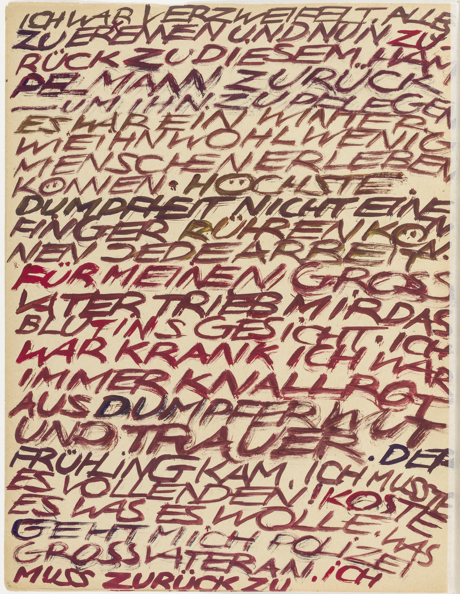 I was in despair. To have gained insight into everything and then have to return to this “puppet” to take care of him. It was a winter that few people could have endured. Profound dullness—unable to lift a finger—everything I did for my grandfather drove my blood to my face. I was sick, I was constantly beet-red from mute rage and grief. Spring arrived. I had to finish it! Whatever the cost. What do I care about the police [or] grandfather. I have to go back to
